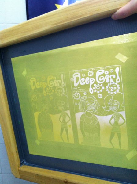 Prepping this screen in my bathtub. It’s for the Deep Girl thank you card. Look at those fine lines! My secret technique involves a spray bottle and Q-tips.