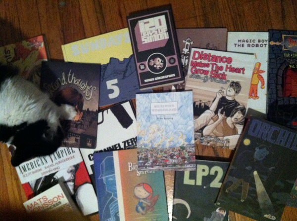 There was a lot of range in the readings this year. Julia Wertz started with her latest auto bio comics. Her humorous asides really added to the reading. Next it was Alabaster, who shared a sweet and sad tale. And man, the art was so beautiful I wanted one of the panels tattooed on my flesh (well, maybe not because I’m chickenshit about tattoos and generally not a fan of them). Nathan Bulmer followed with some strips that really had the house laughing. Gabrielle Bell’s strips were hilarious too, with that own distinctive voice which we love so well. Jeffrey Lewis ended the night by talking about the complex comic/album art he created for his cd A Turn in the Dream Songs (LOVE this album). A lot more thought and puns when into the art than I ever realized.