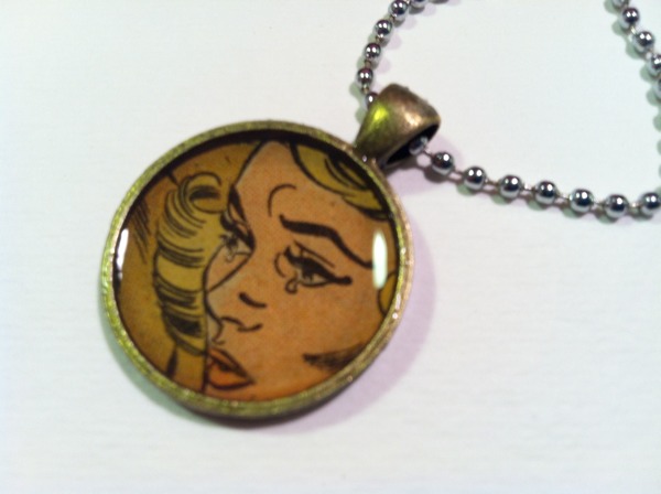 The Paper Rocket Craft store is now carrying jewelry! I made these necklaces out of old romance comics (actual printed pages, not color photocopies). No two necklaces are the same. I use almost exclusively silver age DC romance comics, because they have some of the best art (and lots of crying). They are pretty easy to collect and aren’t too expensive. I wouldn’t have the heart to cut up golden age comics (even if I could afford them). DC has this stuff on file, and better collectors than I have an archive. Aldo, I try to buy damaged and low grade copies. So I think I can get a pass for destroying a book.