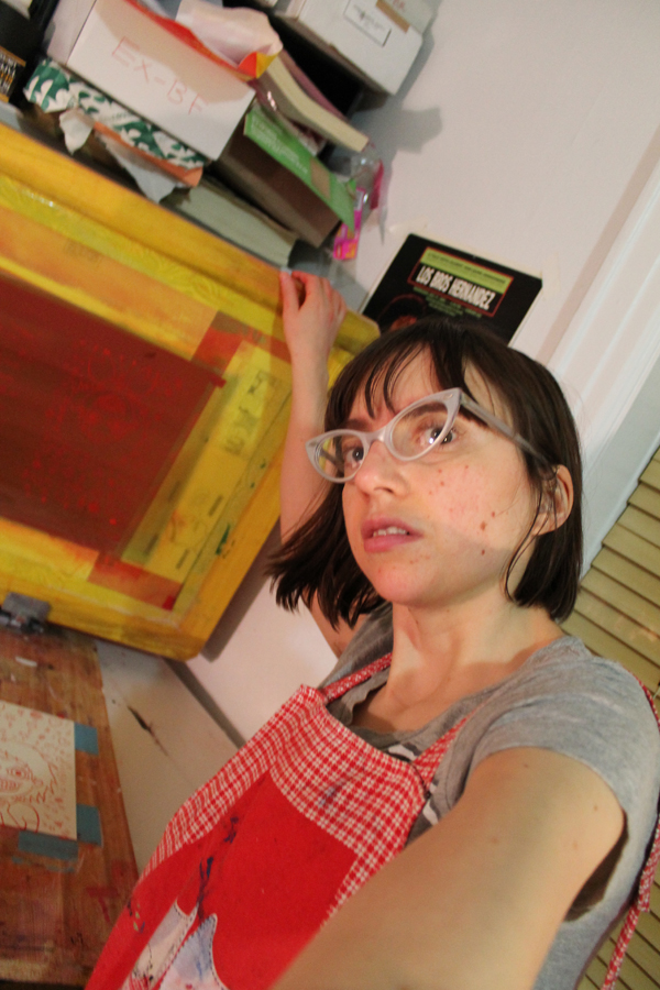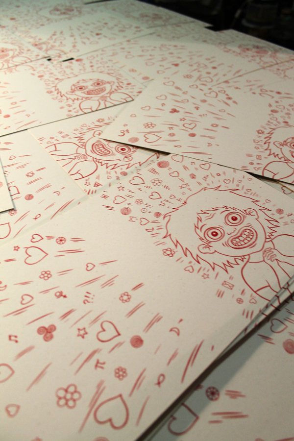I started printing today. My first step was to print the inner covers. It was just one color; no registration this time. Piece of cake! Well, the screen was a little tricky. Ariel’s lines were a bit fine. I had to bump them up a bit.