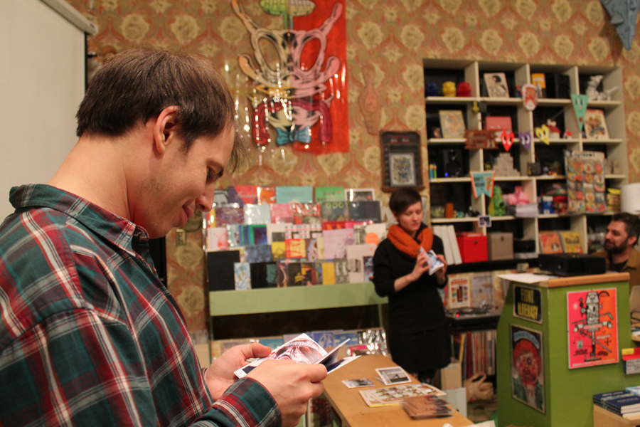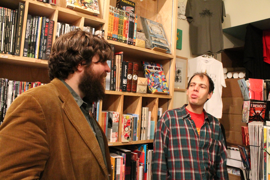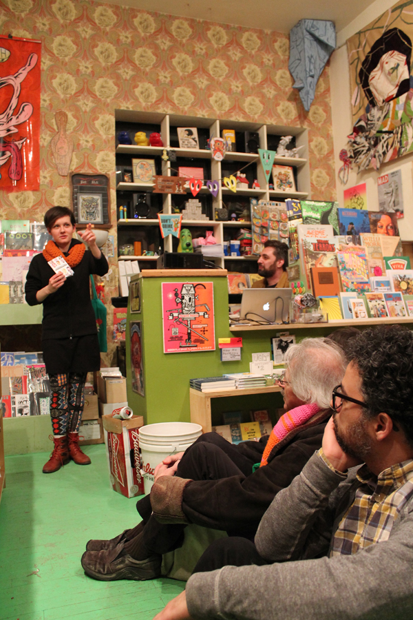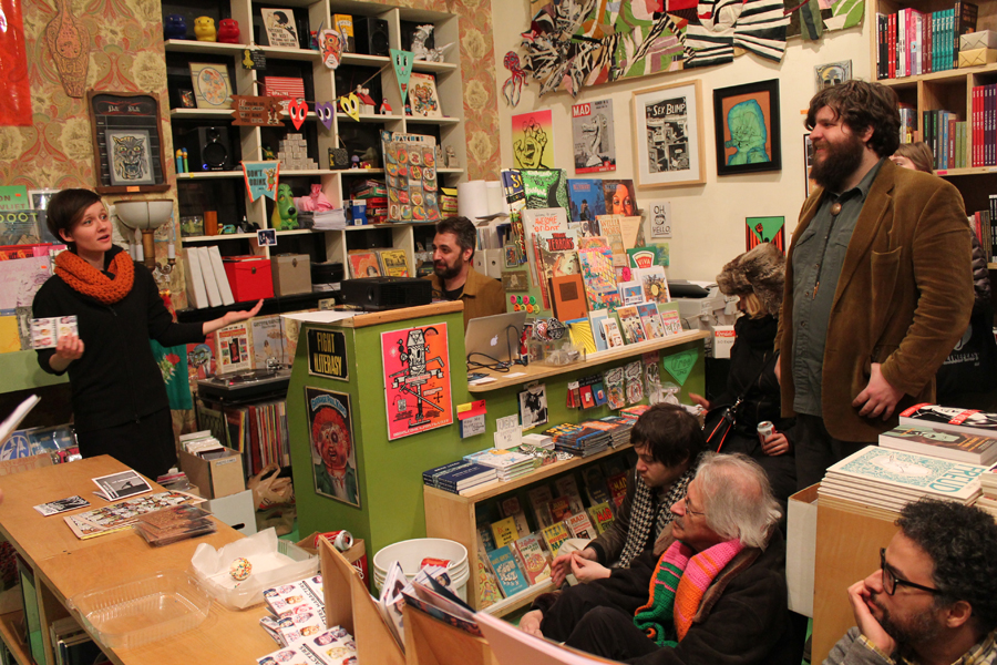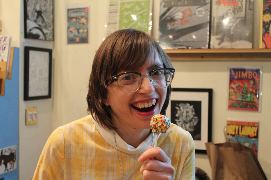 The Paper Rocket & Friends Birthday Release party was a hit! I couldn’t have asked for a better birthday. The room was filled with friends enjoying cheap beer and cake pops (as of late, my favorite things). I gave a little presentation on the production process involved in Character (because, why not, I think it’s interesting) and Jeffrey Lewis showed us some illustrated music videos he’s been working on. Jess did a painting demo, using Desert Island owner Gabe Fowler as her subject.